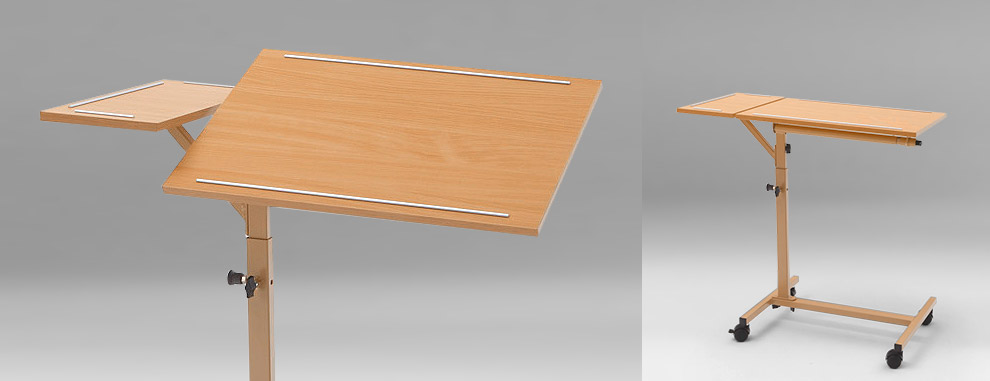 Der Bett- und Beistelltisch Duo hat eine 2-geteilte Tischplatte: Der kleiner Teil bleibt immer in der Waagerechten, der größere Teil lässt sich horizontal schwenken. So kann der Bewohner bequem eine Tasse Kaffee auf dem Tisch abstellen und ihn gleichzeitig als Lesepult verwenden.