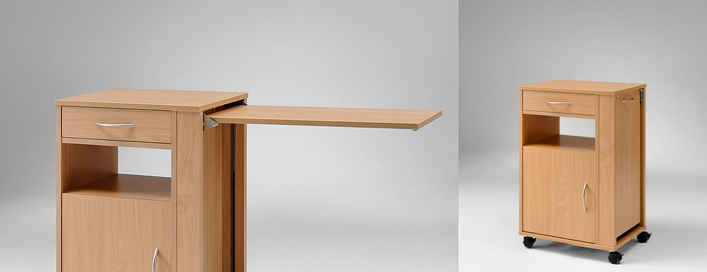 Der Nachttisch Hermann ist sowohl mit als auch ohne ausklappbare Bett-Tischplatte lieferbar. So lässt er sich an die Bedürfnisse des Bewohners und die Raumsituation ideal anpassen. Schublade, Schrank und Fach bieten viel Stauraum für Bücher, Geschirr oder Pflege-Utensilien. Alle 4 Doppellaufrollen sind feststellbar. Dadurch ist der Nachttisch standfest und gut verfahtbar zugleich.